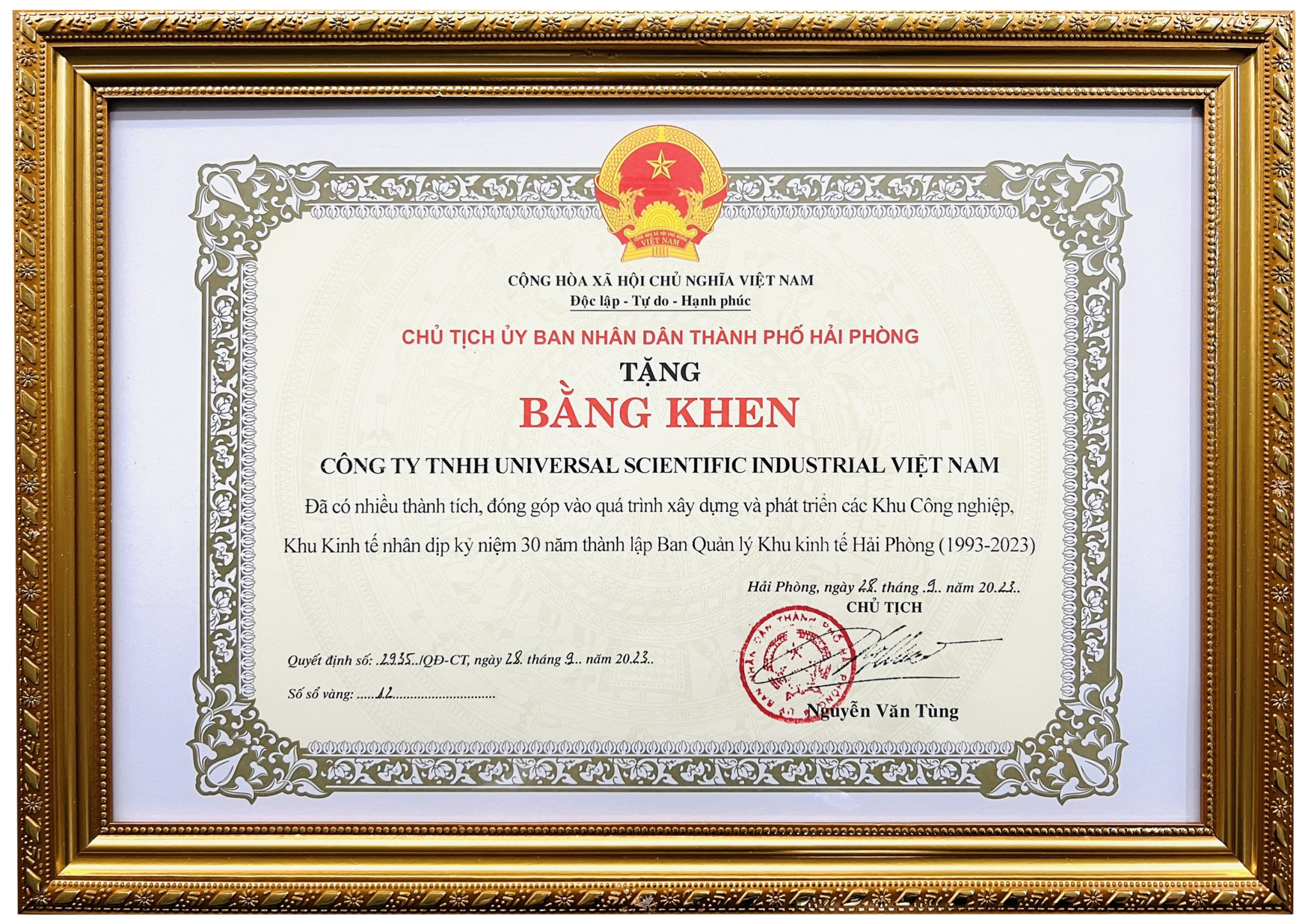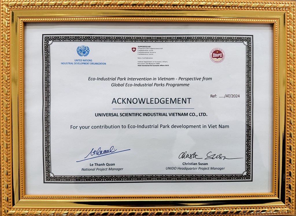 越南生态工业园区贡献感谢状