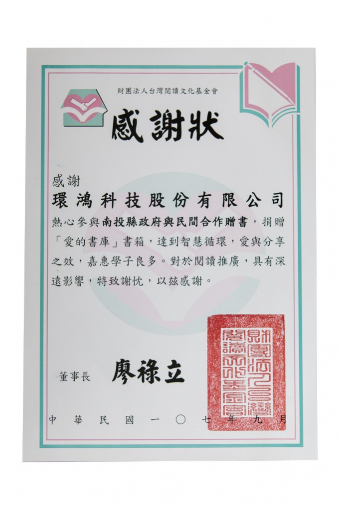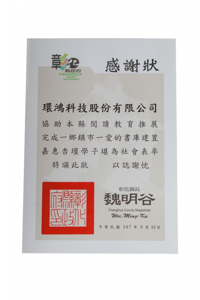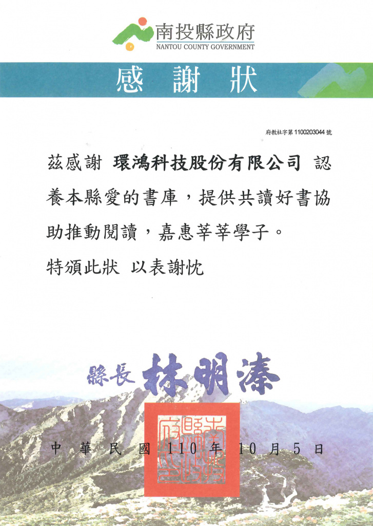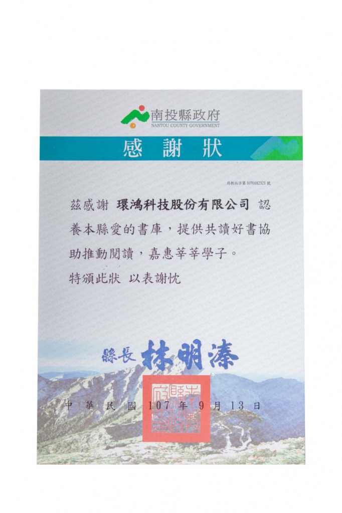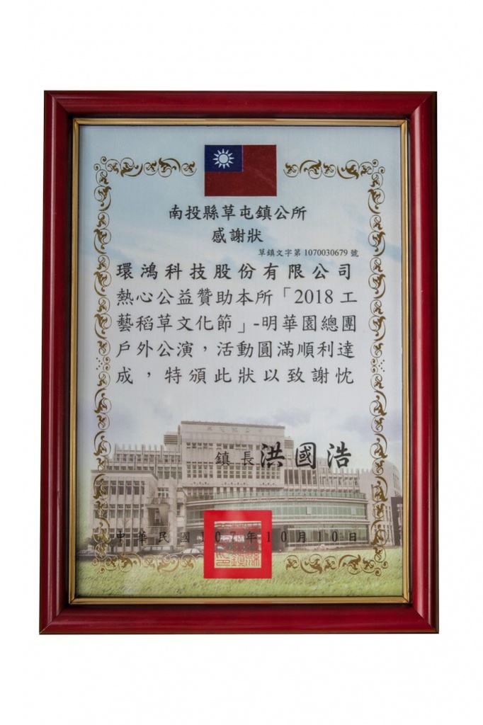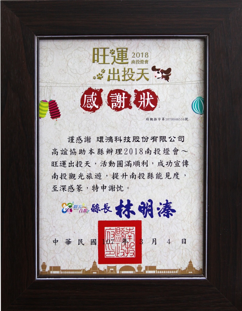 2018南投县政府感谢状 – 南投灯会赞助 (台湾厂)