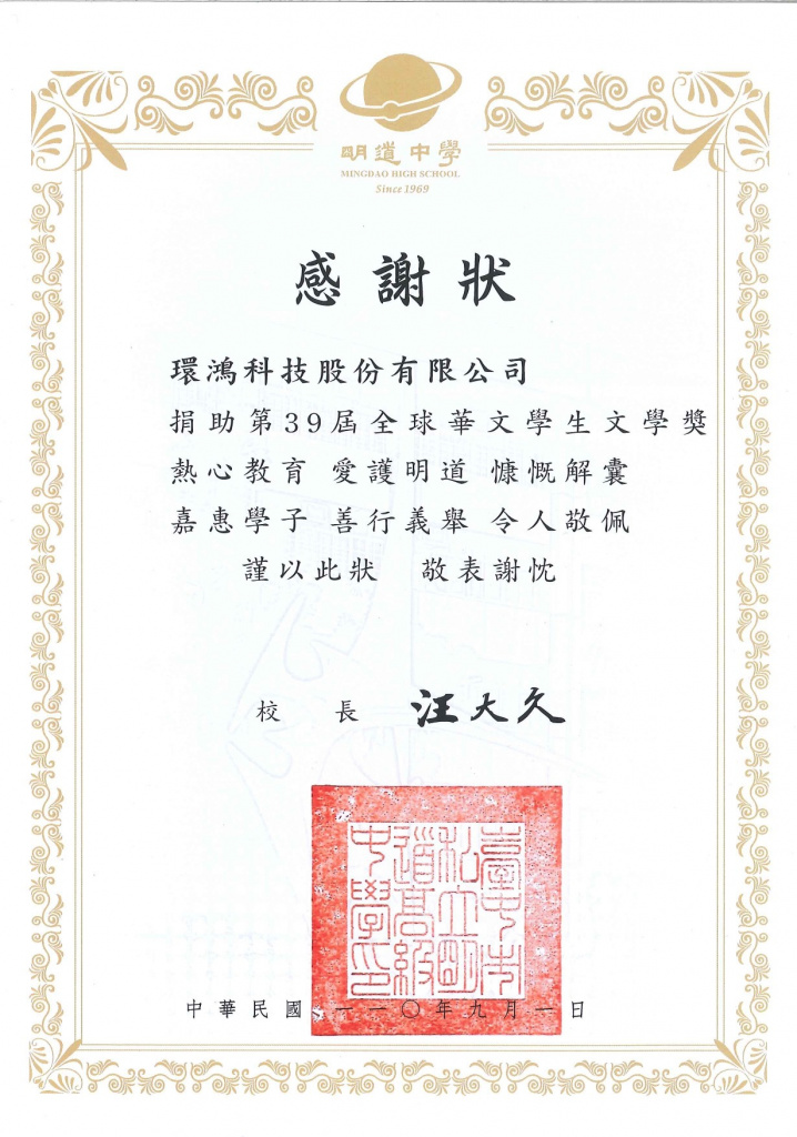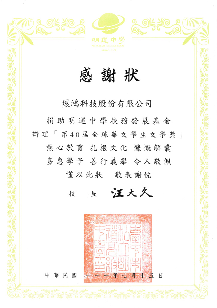 "AG真人百家乐官方网站" 明道中学感谢状–第40届全球华文学生文学奖 (台湾厂)